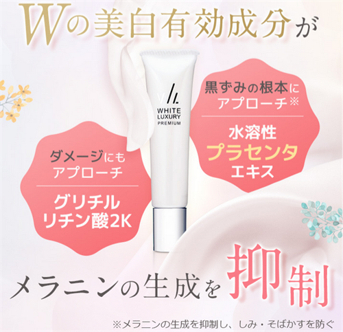 メラニン生成を抑制してしみやそばかすを防ぐ有効成分を配合したホワイトラグジュアリープレミアム。
