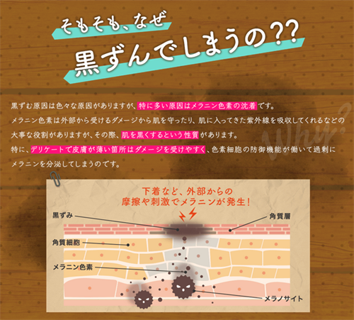 さらに女性はおりものシートやナプキンの利用で下着をさらに締め付けて摩擦することが多いので、デリケートゾーンはメラニン色素が沈着しやすいのです。