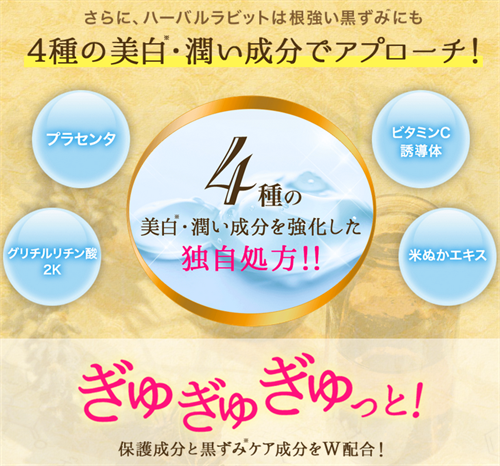ハーバルラビットの配合成分はメラニン色素を抑制する作用が期待できる「水溶性プラセンタエキス」という有効成分を配合しています。