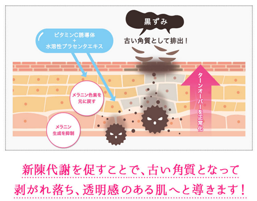 肌の新陳代謝を活発にすると角質層内のメラニン生成が抑制され、黒ずみ原因は肌の上に押し出されターンオーバーのサイクルで新しい角質層へと生まれ変わります。