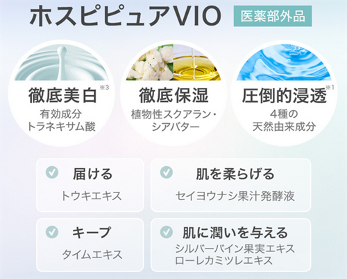 ホスピピュアVIOは美白の有効成分が認可されている医薬部外品で美白と保湿の両方からデリケートゾーンにアプローチを実現しています。