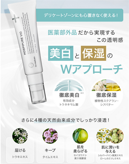 医薬部外品のホスピピュアVIOには新製法の有効成分トラネキサム酸を配合しており、くすみや黒ずみの原因となるメラニン生成を抑制することが可能です。
