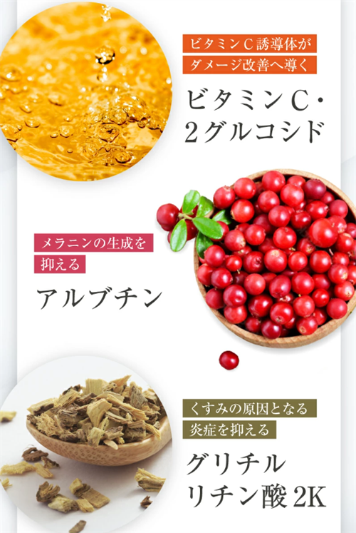 特に、ビタミンC・2グルコシド、アルブチン、グリチルリチン酸2Kなどの3つの有効成分が、シミや黒ずみを改善するために働いてくれる点が魅力的です。