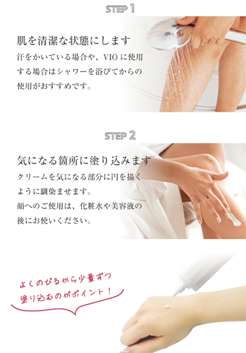 | 塗布方法 | 気になる部分にクリームを塗布 |