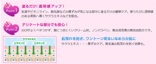 サクラエキス、ビタミンC、ビタミンE(保湿)が配合されており、これらの成分が肌の透明感を高め、美肌へと導きます。